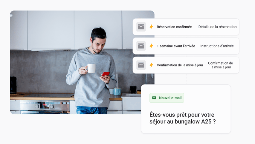 En nous basant sur les meilleures pratiques de nos clients, nous vous proposons des flux de communication éprouvés pour les confirmations, les annulations, les relances de paiement et les modifications de séjour. Vous ne partez pas d'une feuille blanche.