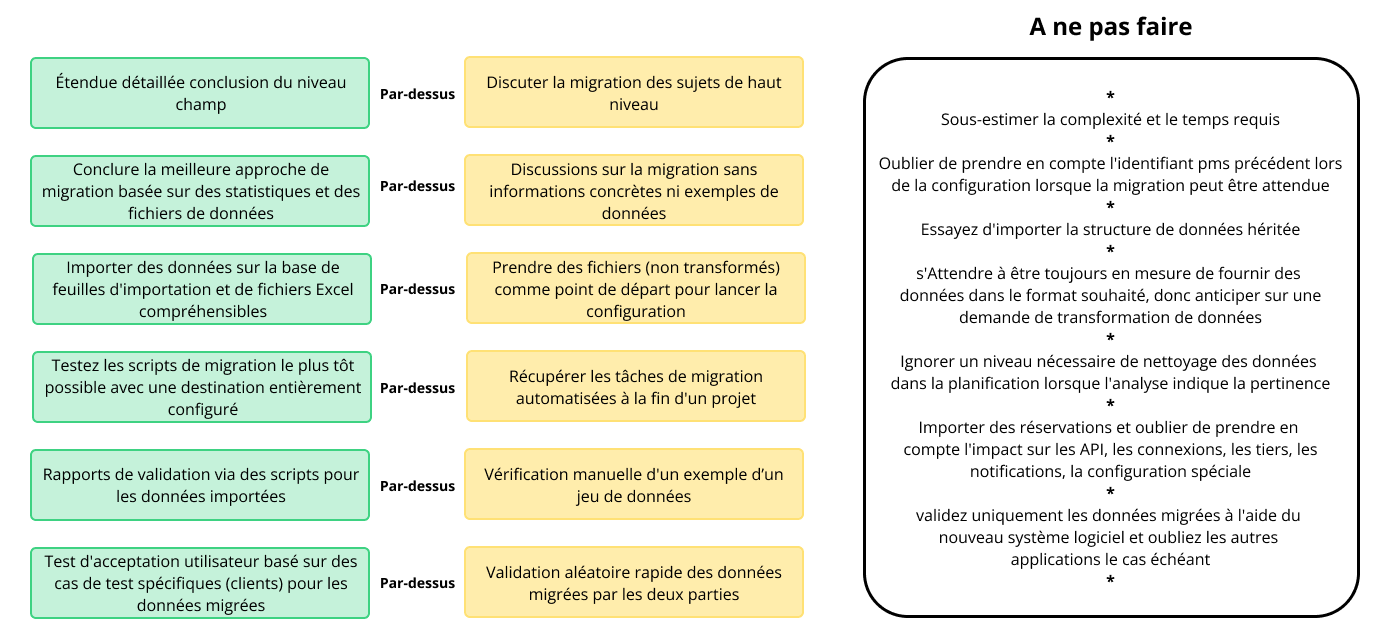 Les bonnes pratiques issues de nombreux projets de migration de données ont été condensées en directives spécifiques, résumées dans l’aperçu ci-dessous. En appliquant ces principes et en évitant les pièges courants, la migration des données peut être réalisée de manière contrôlée et structurée, garantissant ainsi son succès.