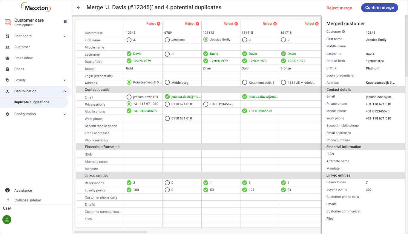 To prevent false positives, flagged records are not automatically merged. Instead, they are presented for user review, ensuring that no genuine customer data is inadvertently altered.